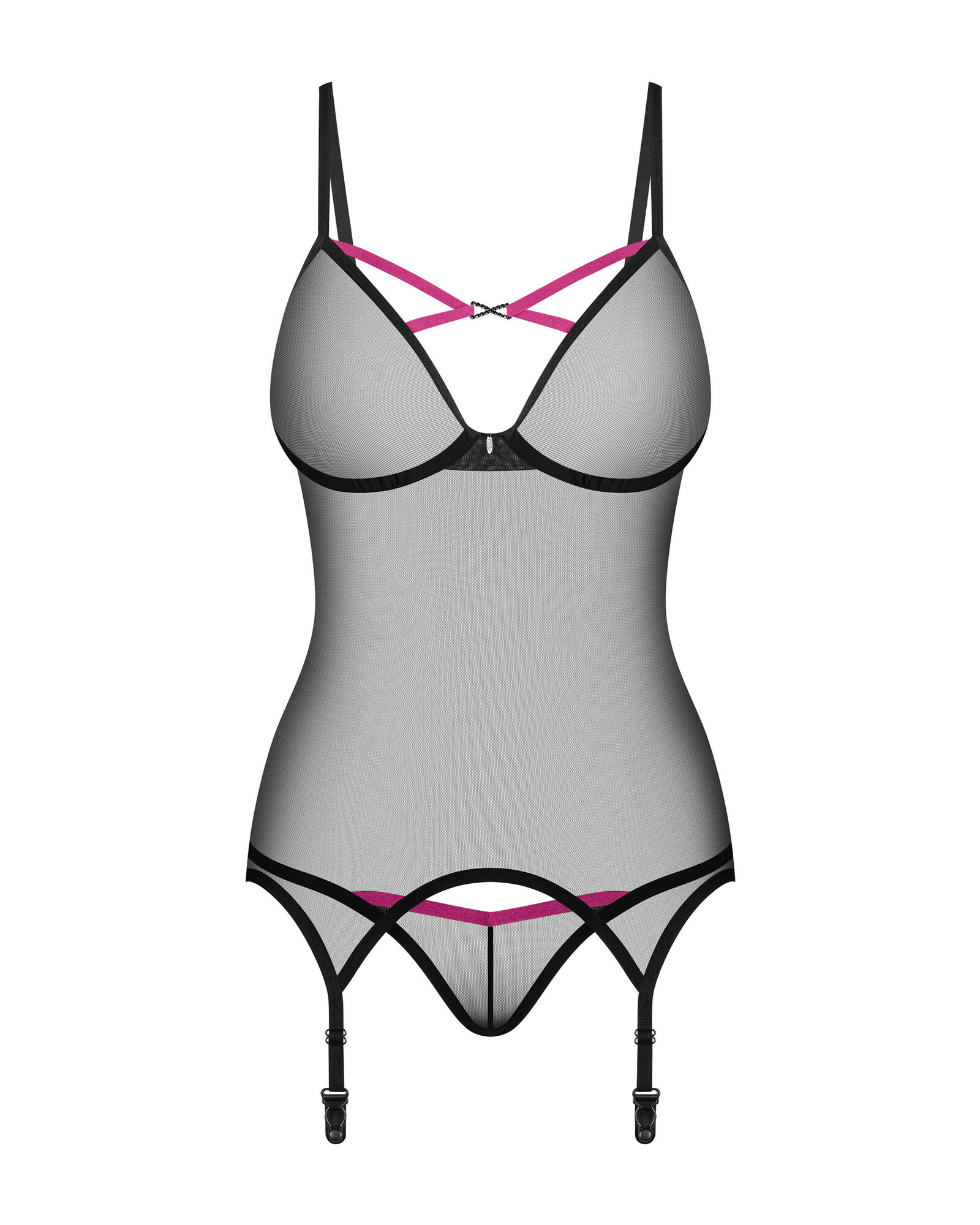 Jemné spodní prádlo, které svádí zajímavými detaily! Černý korzet a tanga z kolekce Novenes jemně obepínají ženské tělo. Díky této extrémně příjemné průsvitné látce, lesklému přívěsku mezi prsy, barevným ramínkům a integrovaným podvazkovým páskům budete po celou noc středem pozornosti.