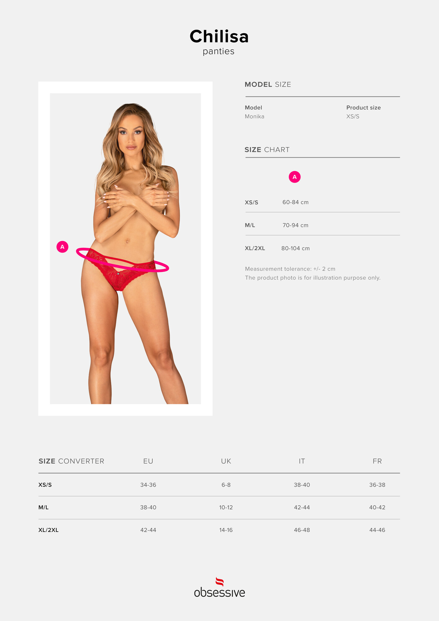 Produkt Krajkové kalhotky Chilisa panties - Obsessive prodáváme v těchto velikostech: XS/S, M/L, XL/2XLa barvách červená5901688255858, 5901688255872, 5901688255896