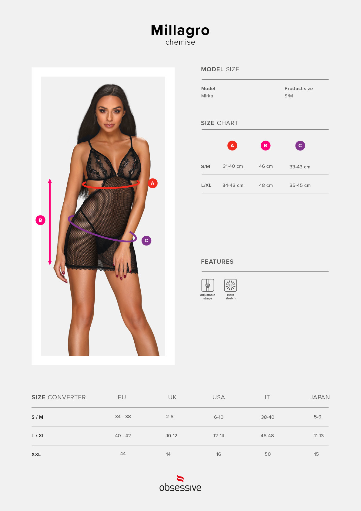 Produkt Půvabná košilka Millagro chemise - Obsessive prodáváme v těchto velikostech: S/Ma barvách černá5901688231548